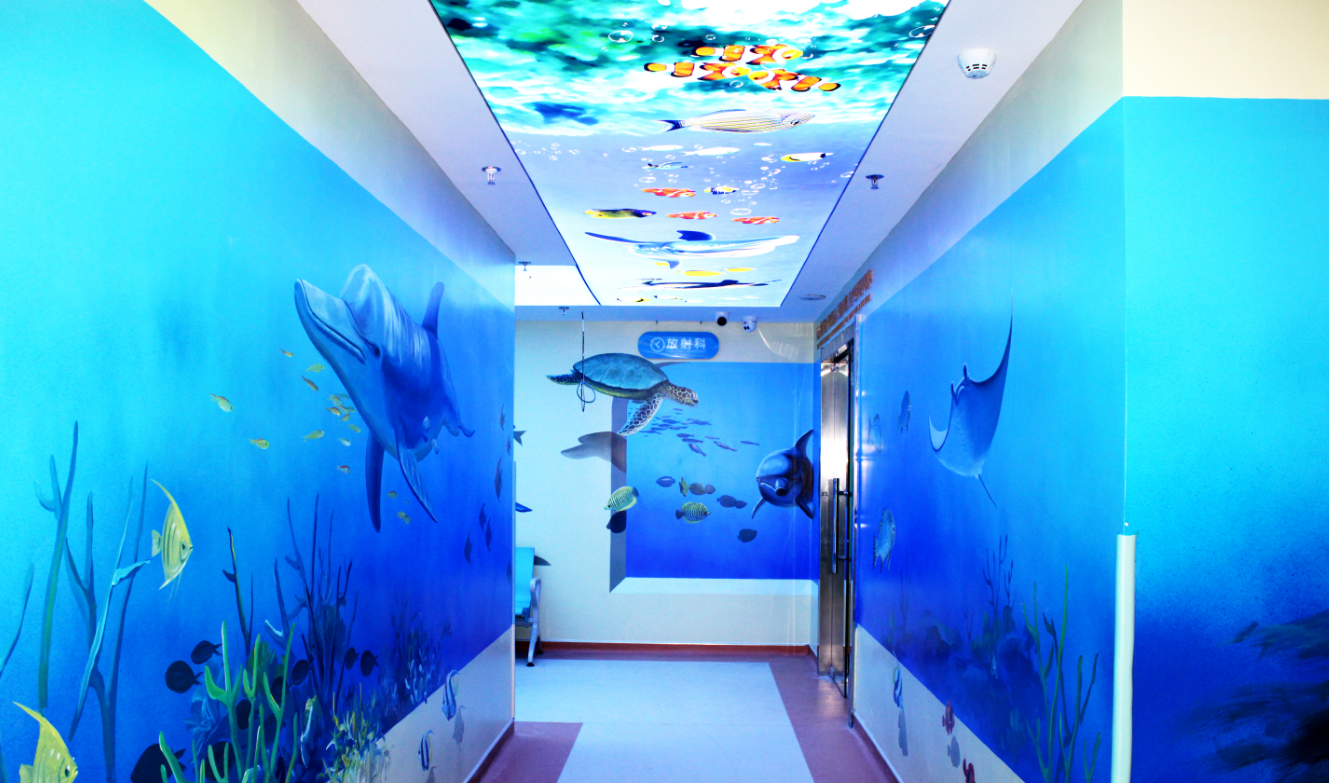 最有趣的是医院负一楼的海底世界。走道以天蓝色为基调,配以3D画法,在柔和灯光下,大白鲸活灵活现,感觉在身边游来游去,海龟则懒洋洋的划水,一副慵懒的姿态,而海豚在水中穿梭,长长的嘴巴看起来充满了战斗感,人在“海底”不由自主张开双臂,像“蛙人”般在水中散步。据南京天佑儿童医院科室负责人介绍,进入“蓝色海洋”,孩子会本能地安静下来,配合医生做一些必要检查和康复训练,之所以选择这些可爱的动物,尤其是海豚,对小患者起到积极辅助的治疗作用。