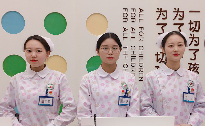 与其他医院的白色基调相比,南京天佑儿童医院是五彩缤纷的,诊室外墙上画着动物或植物,就连医生和护士的工作服上也印着好看的粉红色花瓣,看上去像邻家小姐姐那般亲切。医院的问诊台就是由不同颜色的六边型拼接而成,猛看像一只大足球,工作人员“藏”在球里与孩子们“捉迷藏”。问诊台不远处就放着几张蹦床,脱鞋就进场,孩子“上蹿下跳”十分得意,与其说这是一家儿童医院,不如说它是一处儿童乐园。
